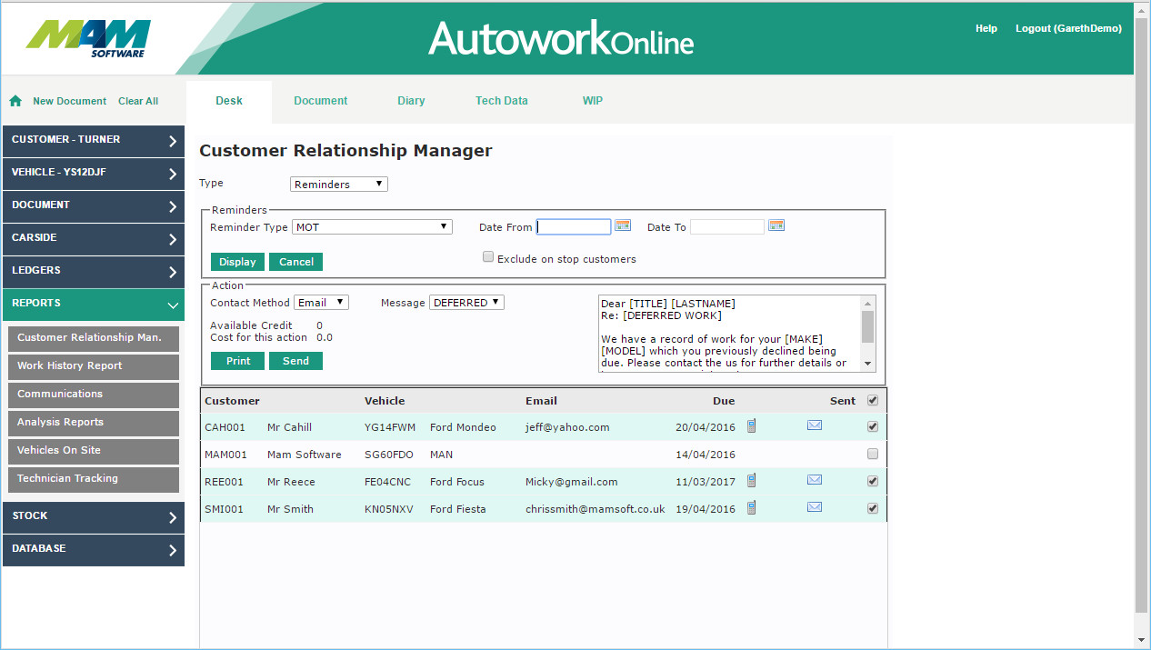 Autowork Online can send customer reminders via email or SMS or export mailing lists for mail merging with a word processor. Reminders can be created for any activity including MOTs, servicing due dates, seasonal checks or promotions. The reminders facility also integrates with the deferred work feature, allowing reminders of deferred work to be sent to customers.