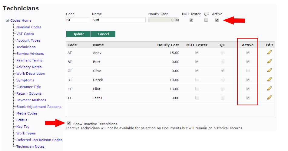 You can view technicians or service writers previously marked as inactive and reactivate them by ticking the Show Inactive Technicians or Service Advisers option at the bottom of the grid.