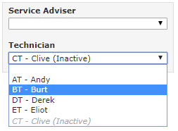 When a technician or service adviser is no longer active, they will not appear in the selection boxes for new documents. However when viewing an existing document to which they were previously assigned they will remain visible but will be shown as inactive in the drop down.