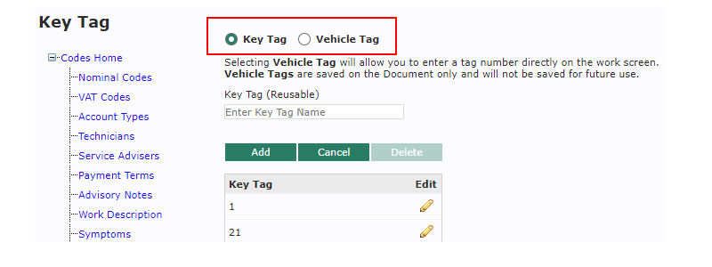 Alternatively you can enable a Vehicle Tag option in the Key Tag codes screen.