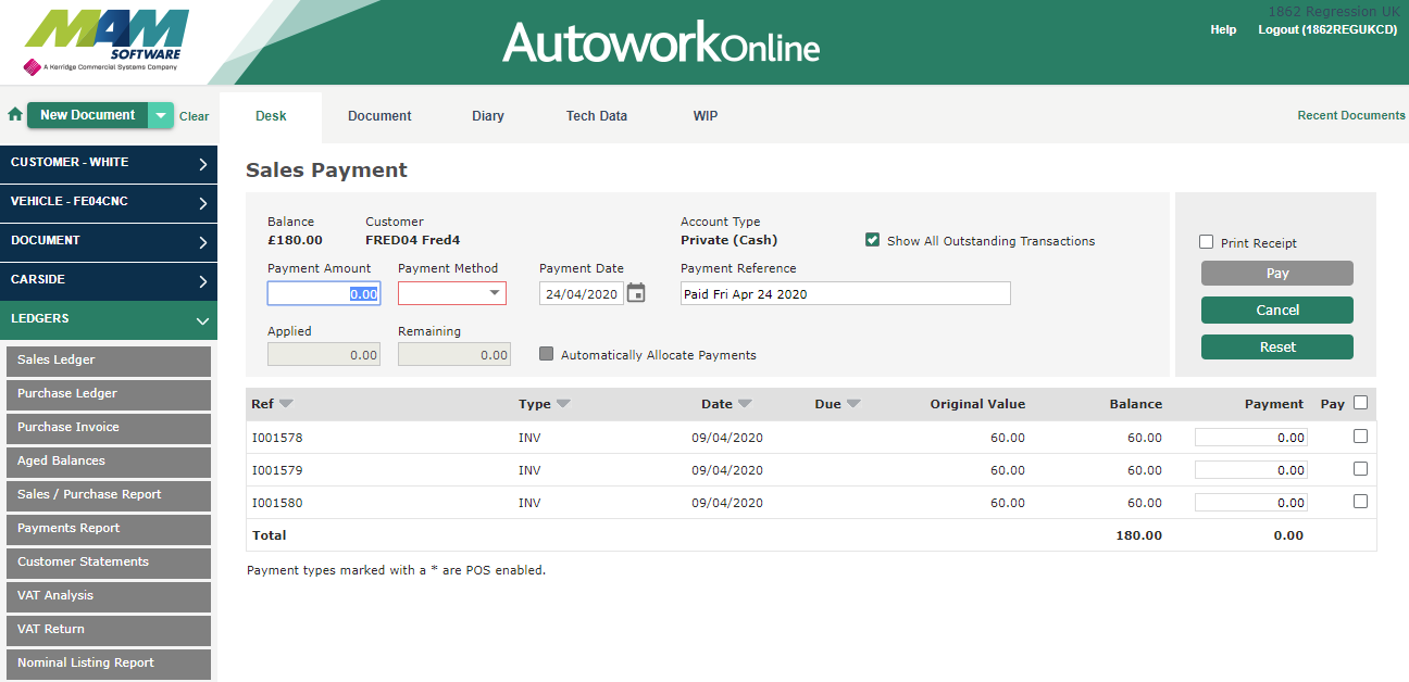ii. Select one or more transactions from the Sales ledger for a single customer and click Pay at the bottom of the screen.