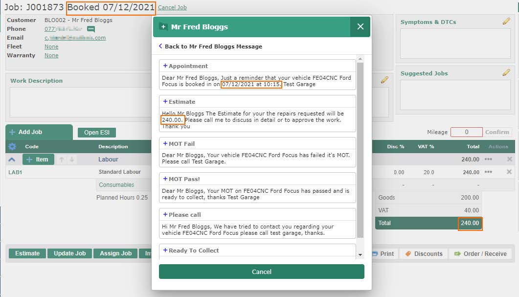 When selecting from your list of predefined messages, each one will be previewed complete with any form filled content from the customer, vehicle or document. That way, you can see what the message will look like before it’s sent.