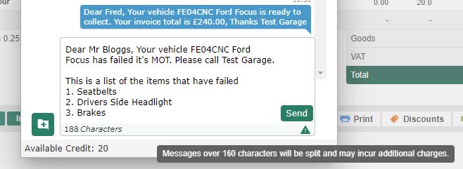 A standard message can be up to 160 characters and costs 1 credit. Messages exceeding 160 characters will be indicated by the icon & tool tip shown. These messages will cost 2 or 3 credits, depending on the length. Your available credit is displayed at the bottom of the message popup – if you’d like to increase the available credit, please contact support.