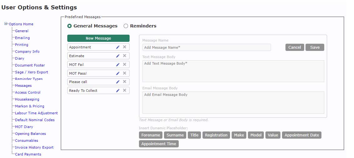 General messages are available in the manual send message screen, while reminders are available in the CRM screen and when using the included Automated SMS feature.