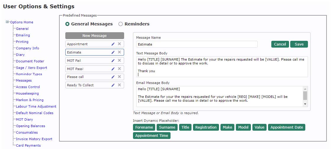 Note that not all form fill information will be available when you send a message – for example, the vehicle fields are only appropriate when sending to a customer with a specific vehicle selected. Similarly, the value field will send the total from the currently displayed estimate, job or invoice.