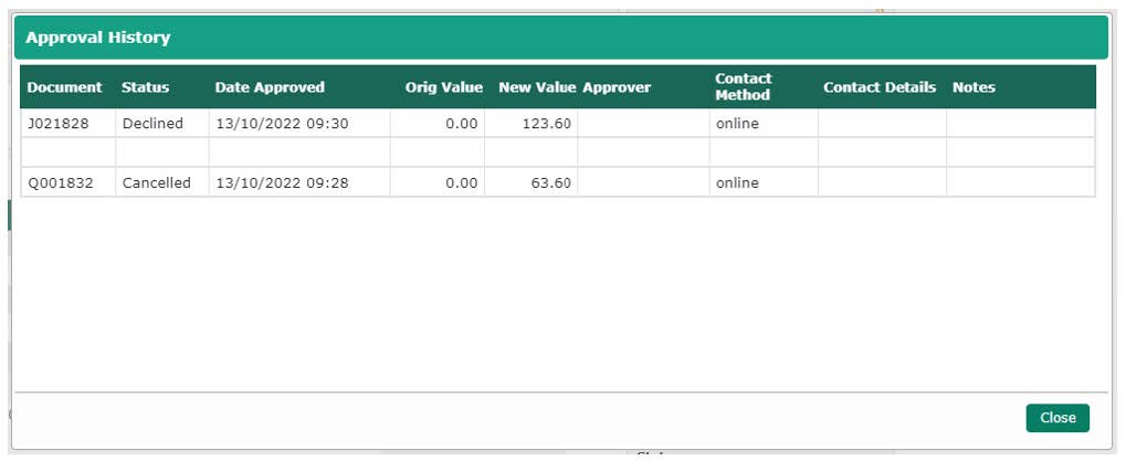 Once approvals are sent for approval and start being actioned, the approval History will start to be built up. On the document the latest entry will be displayed and can clicked on the show the full approval history.