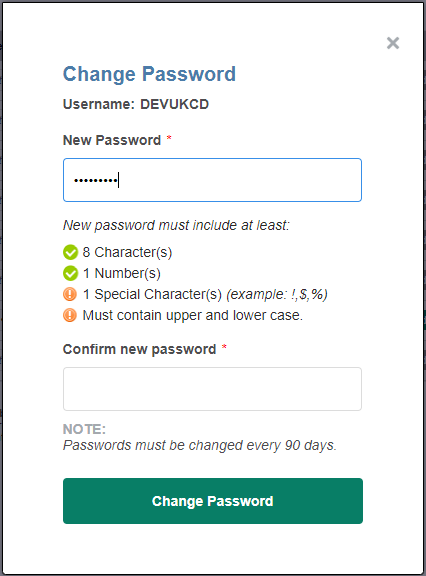 You can also change the password for the user by clicking Change Password. This will display the change password screen (you will also see this when resetting your password via the forgot password link, when a user first logs in, or if your password is reset by support).