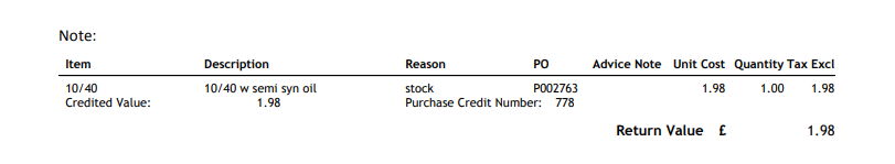 Purchase credit note numbers and the credit amount will now print on completed returns notes. Remember to enter the credit information from your supplier when marking the return complete.