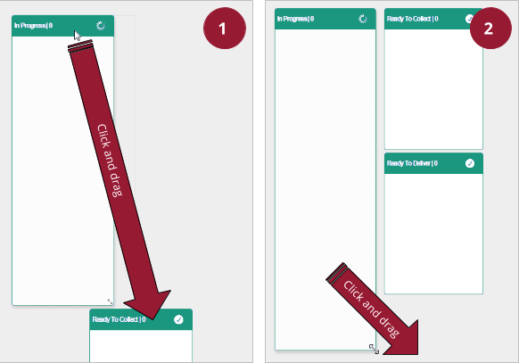 - The next screen will allow you to set the layout of the WIP screen for the selected template. The panes for each status code can be moved by left-clicking and dragging their headers (1), and can be resized by left-clicking and dragging their bottom-righthand corner (2).