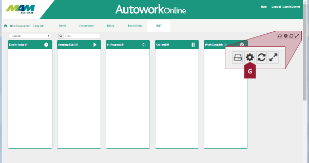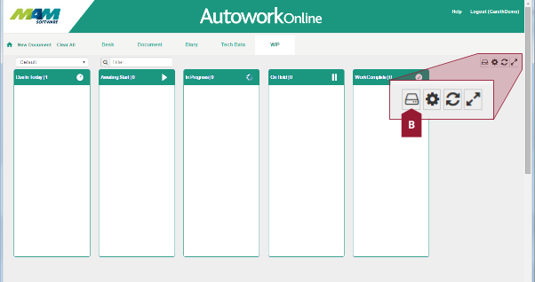 The Autowork Online Work in Progress (WIP) tab allows you to easily view information on currently outstanding jobs and invoices. The documents are sorted into a set of customisable columns, one for each particular status, and the status of a job can quickly be changed by simply dragging and dropping it with your mouse. The WIP screen also offers selectable view templates, these are fully user-customisable, and can be used to set a selection of status codes specific to a particular job role.