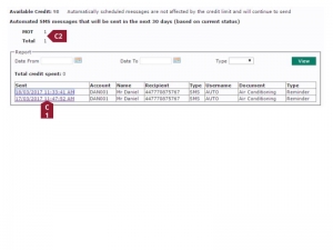 C. The report will list information on all messages sent which match the filters set in step B. Clicking the message sent date (C1) will display the fill message text. Also displayed are projected figures for messages that will be sent in the next 30 days (C2).