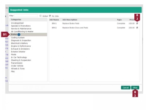 - Select a Category (B1), and then check the boxes (B2) against any jobs you would like to include. Click the Okay button (B3) when you are happy with the selections. This will add the Suggested Jobs, which can then be added to the Job using the process in the Adding Suggested Jobs to a Job in progress section of this document.