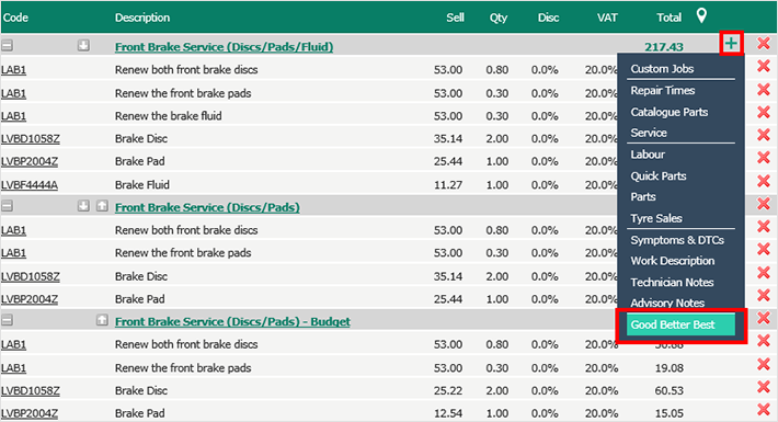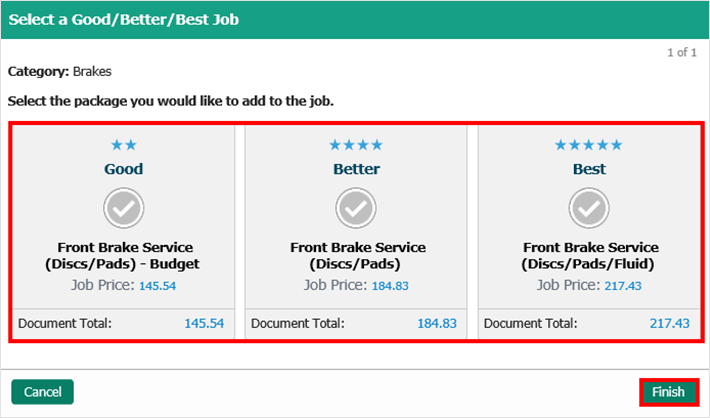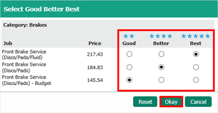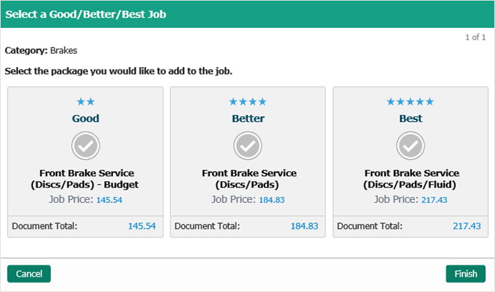 Good Better Best options allow you to present 2-3 similar jobs to a customer. This allows customers to easily see the difference in pricing for various tiers of parts or services.