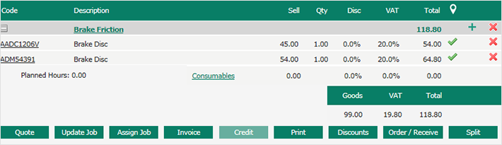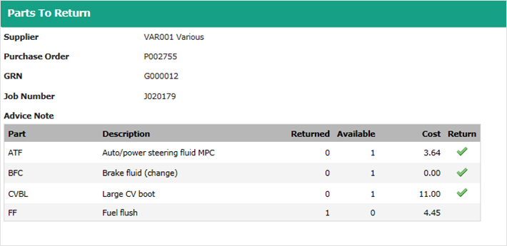 This is the simplest method to record parts for return. When a part has been received from a supplier, a green tick is shown on the Document screen.