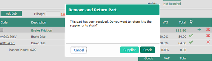 When you delete a received part by clicking the X you will now be asked if you want to return it to Stock or to the Supplier. Choose Supplier if you want to return it.
