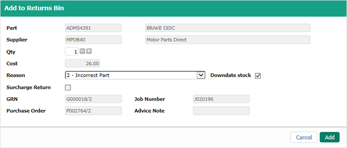 The Add to Returns Bin pop up will open. Other details about the part to be returned will be filled in automatically from the Purchase order. Select a reason and click Add to add the part to the Bin. (Returns Reasons can be customised in the Codes screen).