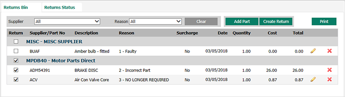 The Returns process for parts has been improved, including the introduction of a Returns Bin. The Returns Bin records details of all parts awaiting return to each supplier until you are ready to return them. Returns can then be created quickly and easily for each supplier and tracked through to completion and credit. The aim is to simplify the returns process and save time, while maintaining an accurate audit to help keep track of parts and minimise losses.