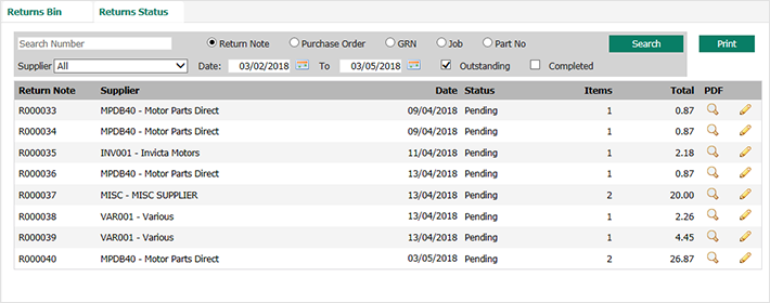 If you have a lot of parts awaiting return, or are returning parts for a specific reason (e.g. Warranty) you can use the drop down filters. You can print this list for stock checking if required.