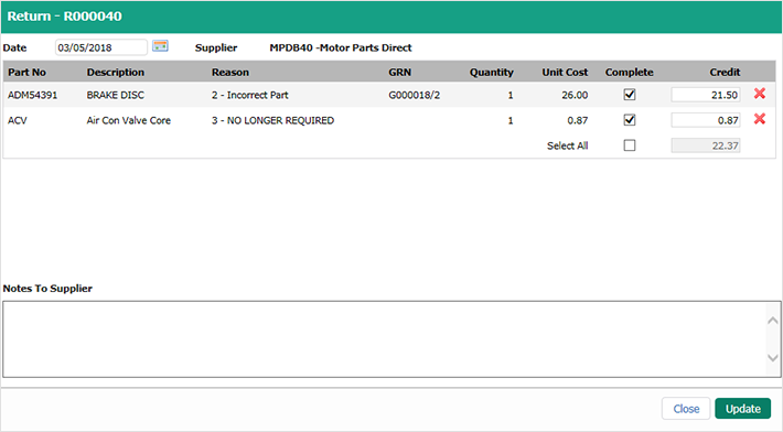 Click on the Edit icon to edit or complete an open return. Parts can be deleted (these will be put back into the Returns Bin) or can be marked as Complete. You don’t need to complete all lines on a return at once. You can also edit the Credit value if it is different from the original cost.