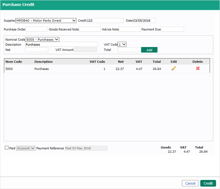 If the supplier has issued you a credit note and you wish to record this, enter the Credit number when prompted. You will then be taken to the Purchase Credit entry screen. The Supplier and Values will be auto populated, but you can amend these as required. You do not have to enter the credit, but doing so will link the credit to the return for future reference.